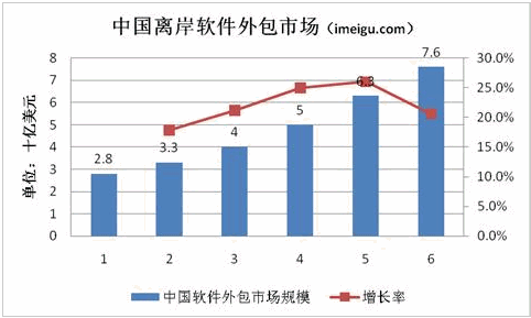 中國IT服務企業承擔的離岸IT服務項目主要是軟件外包。這些業務包括應用程序開發和管理、產品開發、包裝解決方案服務、全球化和本地化服務等。這些客戶包括外國公司和外國公司在中國的分支機構/子公司。中國的離岸軟件外包市場近年來也發展迅速。根據IDC 2010年7月的報告,中國離岸軟件市場規模將從2009年的28億美元增長到2014年的76億美元,年復合增長率為22.4%。
