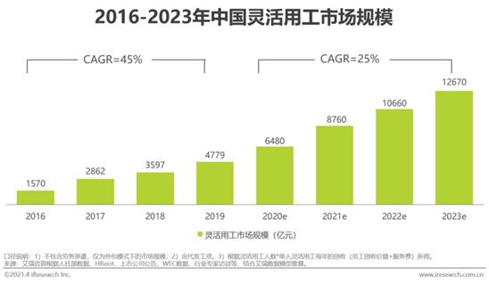 艾瑞《2021年中國靈活就業市場發展研究報告》:如果未來復合年增長率保持在25%,2022年靈活就業市場規模將突破1萬億元。