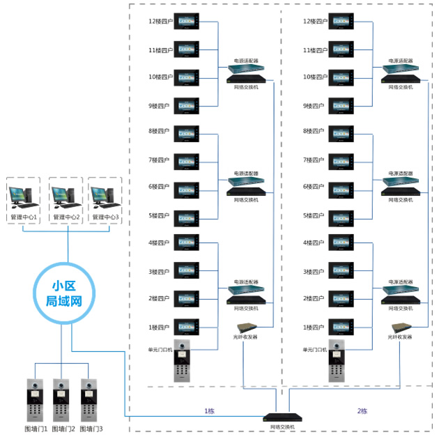 在小區(qū)、單位門口設(shè)置門口機(jī),在物業(yè)門口設(shè)置門口機(jī) 中央設(shè)置管理軟件允許每戶設(shè)置一臺室內(nèi)機(jī),可以實(shí)現(xiàn)以下功能: